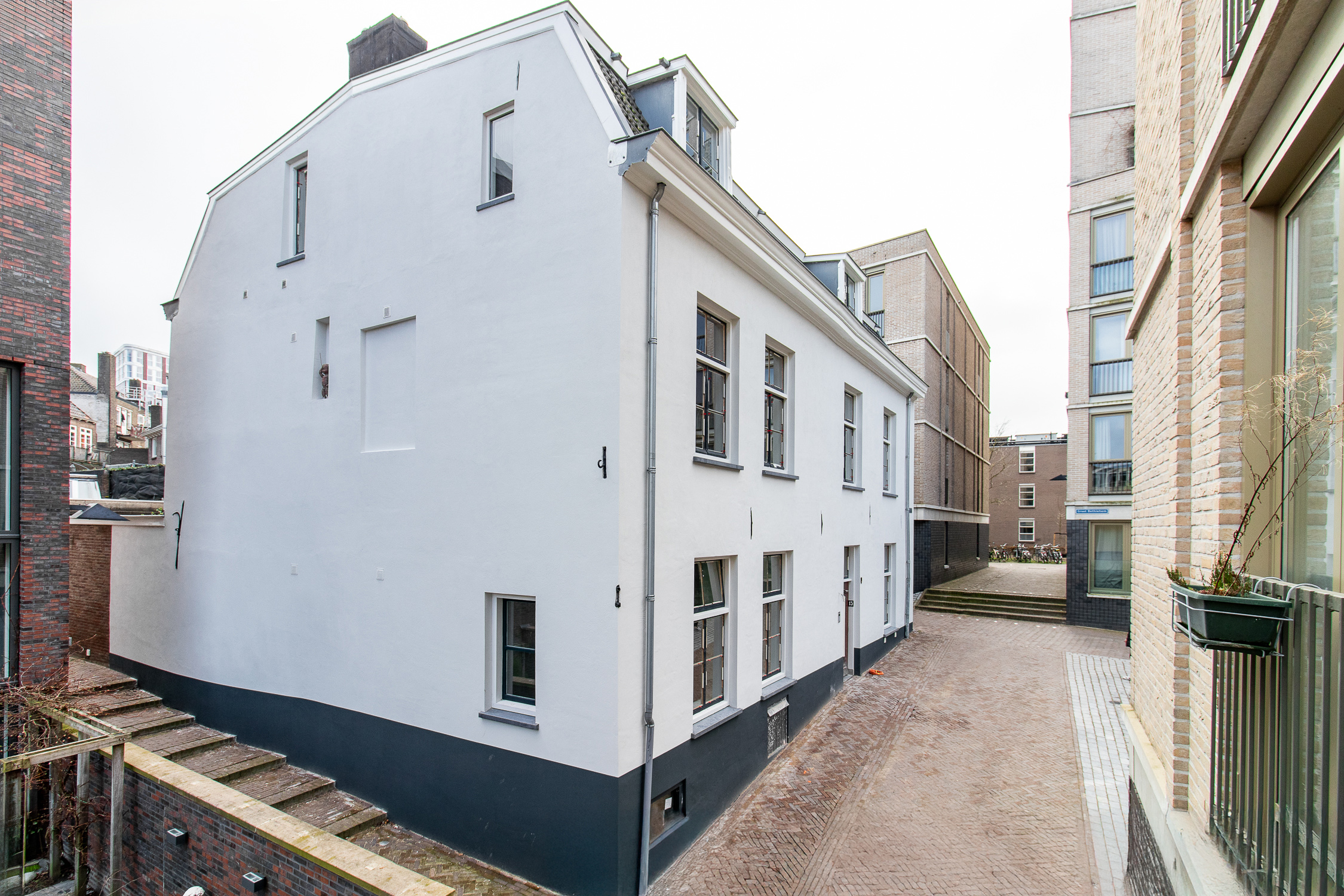De gestucte gevel van het pand is tijdens de renovatie geheel verwijderd en vervangen voor een nieuwe laag stucwerk.